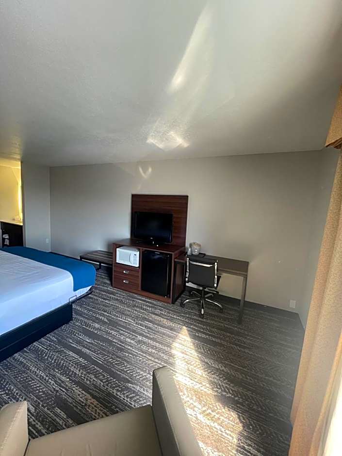 Experience comfort and ease in our King Room with Roll-In Shower - Accessible/Non Smoking, featuring a spacious private bathroom, a cozy king-size bed, and convenient amenities such as a microwave, flat-screen TV, and refrigerator. Unwind in style with air conditioning, and enjoy a cup of tea or coffee using our in-room facilities.
